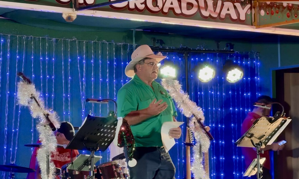 Junee Business and Trades President, Tony Butt, speaking at Christmas on Broadway in 2024 | Photo: © The Junee Bulletin