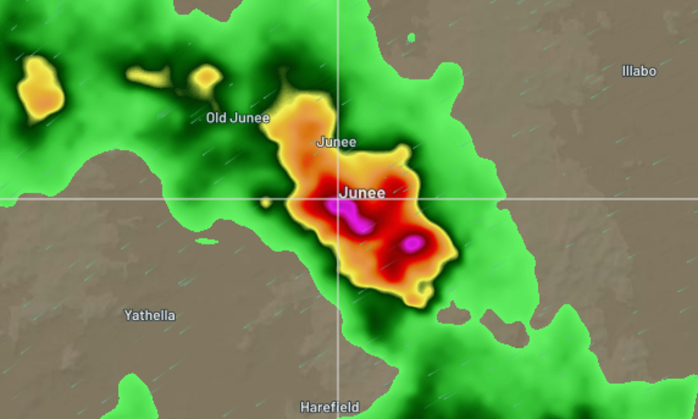 Widespread rainfall totals of up to 10 millimetres in 15 minutes were recorded in backyard rain gauges across Junee, highlighting the storm’s intensity despite its brief duration.