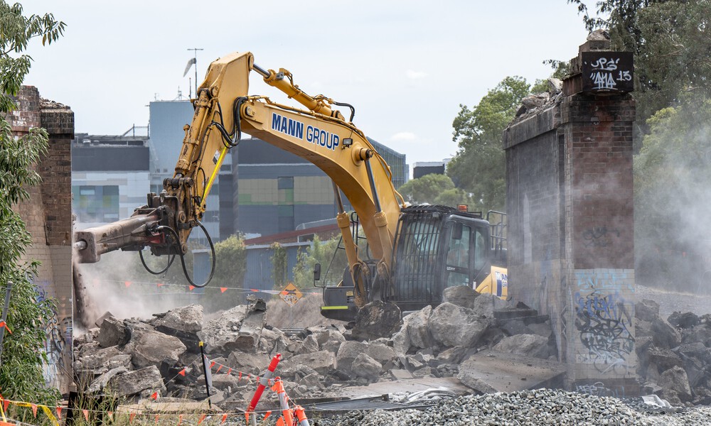 After months of meticulous track possession planning, two 37-tonne excavators progressively demolished the bridge before workers moved in to dismantle the brick abutments and central brick pier.