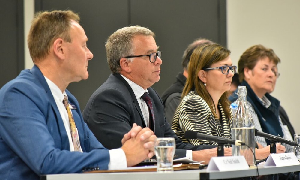 Junee Shire Council general manager James Davis (centre) pictured with former Junee mayor Neil Smith (left) addressing the 2023 Senate Inquiry into regional bank closures | Photo: Junee Shire Council