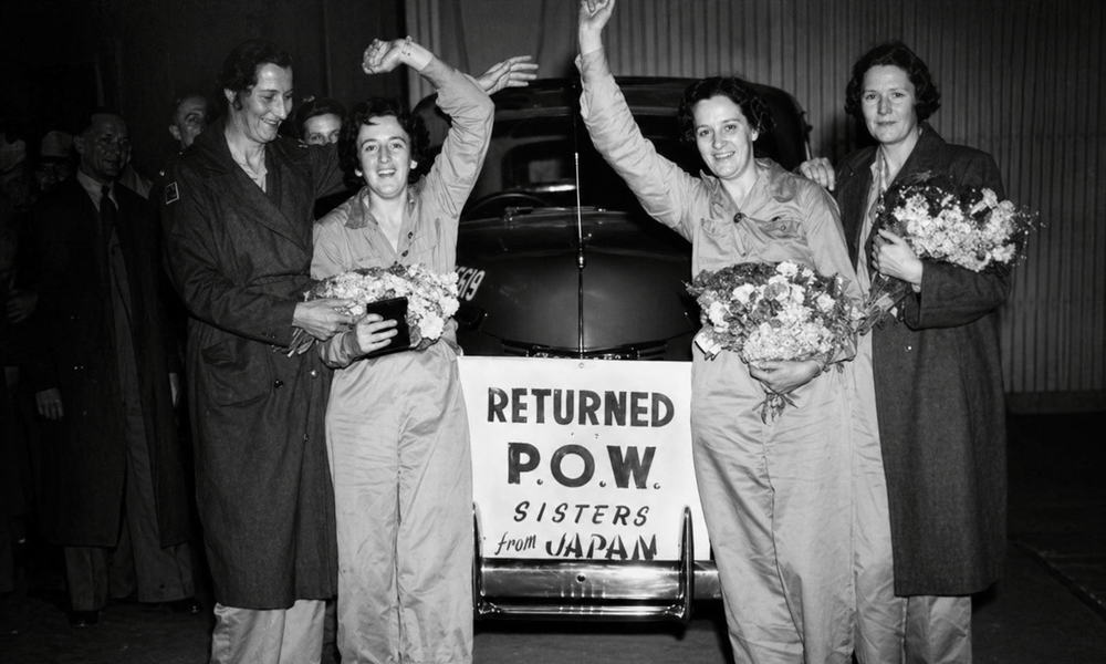 Photographs from the time show Keast standing proudly among the returning prisoners of war, bouquets in hand, in front of a car bearing the words: “Returned POW Sisters from Japan.”