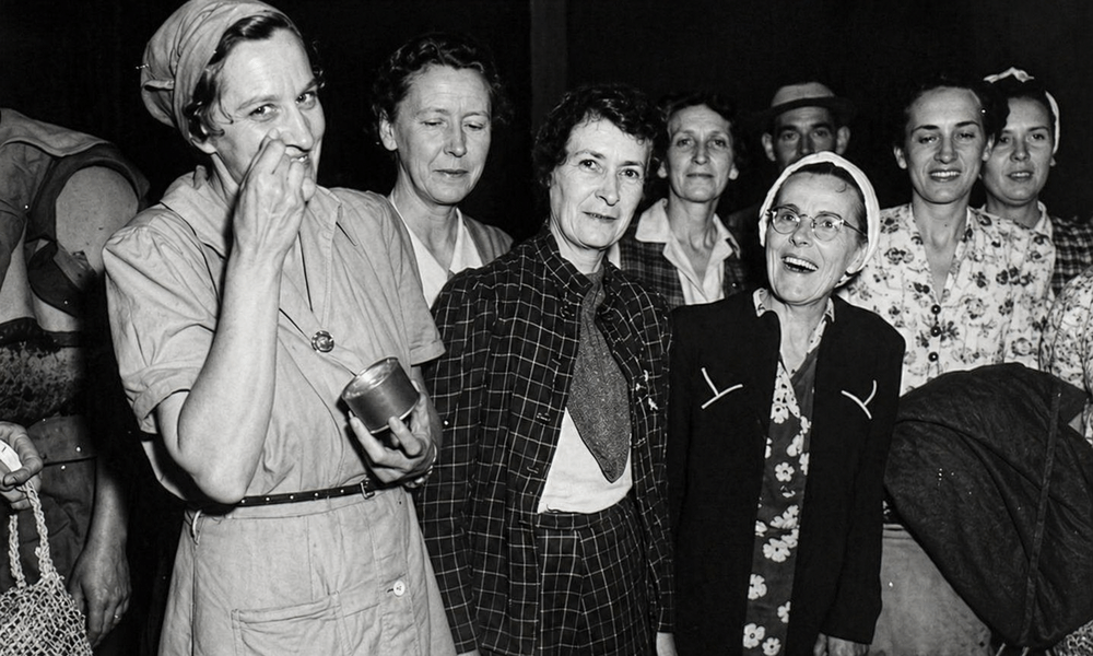 Fellow rescued nurses watch on as Lieutenant Daisy (Tootie) Keast enjoys canned pork and apple sauce in September 1945, the first she had tasted in four years. | Source: Australian War Memorial