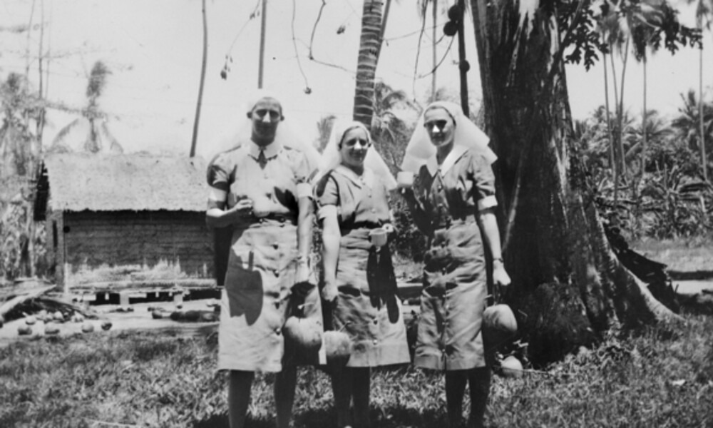 Three of the six Australian Army Nursing Service (AANS) nurses, who were part of Lark Force, enjoying a tea break outside in Rabaul, New Britain. Left to right: Captain (Capt) Kathleen (Kay) Isabel Alice Parker; Lieutenant (Lt) Daisy (Tootie) Keast; and Lt Marjory J. (Jean) Anderson | Source: Australian War Memorial